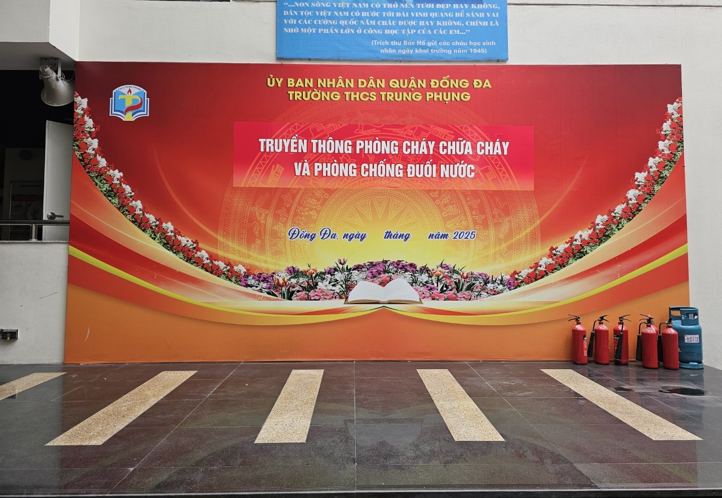 chiến sĩ thuộc Đội PCCC, Ban giám hiệu nhà trường, CB, GV, NV cùng toàn thể học sinh trường THCS Trung Phụng.